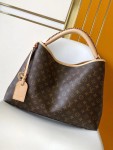 La borsa Again rivisita in una versione dalle linee più morbide e moderne l'iconico modello Artsy, lanciato per la prima volta nel 2010. L'accessorio, straordinaria espressione dell'eccellenza artigianale della Maison, è realizzato nella classica tela Monogram ed è rifinito dal manico intrecciato a mano e dal porte adresse personalizzabile. L'elegante creazione, impreziosita da un moschettone dorato, presenta un interno capiente dotato di numerose tasche, perfetto per contenere anche un computer portatile.